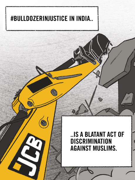 A series of graphic narratives for the campaign "bulldozer injustice" by Amnesty International. Speaking of the unlawful demolition of Muslim properties by the Indian authorities, peddled as ‘bulldozer justice’ by political leaders and media. Also how is JCB part of this hate narrative against Muslims in India.